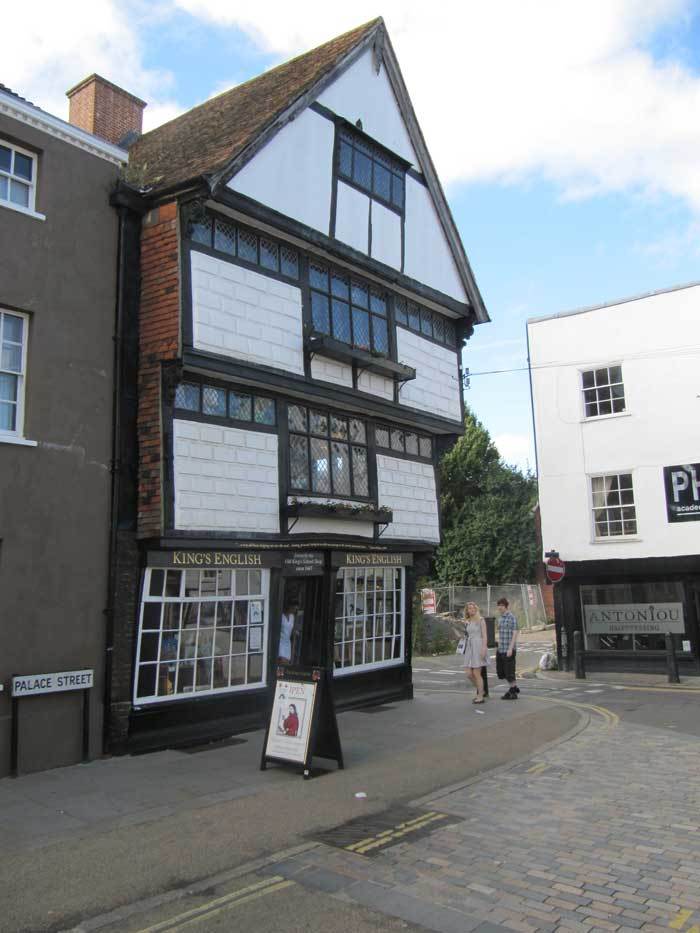 For many years this building (Image 1) was known as Sir John Boys’ house, on the erroneous supposition that he owned it or lived in it. (Sir John was recorder of Canterbury and founded Jesus’ hospital in Northgate.) As Sir John died in 1612, and the date on the roof gable finial has been read as 1617, this was clearly an error. The 3½ storey building is timber framed (now also steel framed – more below) with jetties towards Palace Street and King Street. The long rows of horizontal windows support the surmise that it was once used by immigrant weavers. It is much photographed as it appears to lean markedly to the right. This leaning, the result of modifications to and piercings of the central chimney stack over many years, culminated in the total collapse of the stack in 1988, with the fall of several tons of brickwork into the cellar. Dramatic emergency intervention by the City Council and Canterbury Archaeological Trust prevented a collapse, and restoration work, including the insertion of a steel support frame, has saved the building for posterity. More recently it has been known as the King’s School shop and King’s English bookshop but is now a charity bookshop.