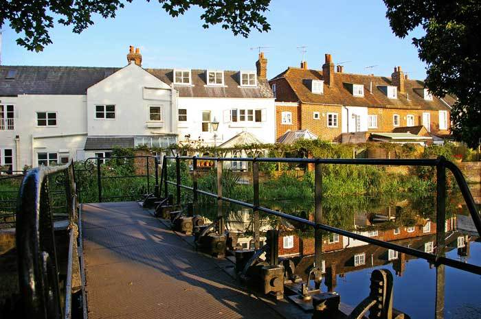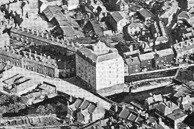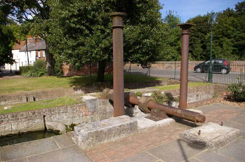 For nearly 150 years the second largest Canterbury building by a wide margin was the Abbot’s Mill, standing where Radigund Street bridge now crosses a branch of the Great Stour (Image 1). It was designed by John Smeaton (of Eddystone light house fame), built in 1792 at a cost of £8000 and burnt to the ground in a spectacular fire in 1933 (Image 2). The 100 feet high six storey building with octagonal turret replaced an earlier mill known as Brown’s mill. Two water wheels, each 16 feet diameter, produced ‘500 quarters of corn weekly’ despite a drop in water level only a little over 5 feet. Earlier mills on the site had been owned by St Augustine’s (hence the name) but it was owned by the City from the dissolution in 1538 up until Victorian times. Owners in Victorian times have included James Simmons and the artist Sydney Cooper, who purchased it when he married Mary Cannon the miller’s daughter. There is no evidence that Cooper had any interest in milling or (as often asserted) in painting views from the octagonal look-out. He was simply easing the finances of his bride’s father. All that now remains of the Smeaton building is the spindle of one of the wheels and two iron pillars.