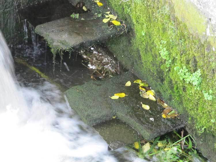 - stones set in recent years in one water wheel channel (Image 8), intended for use by otters (none have yet turned up!) – and vertical boards in the other wheel channel to assist fish moving up river