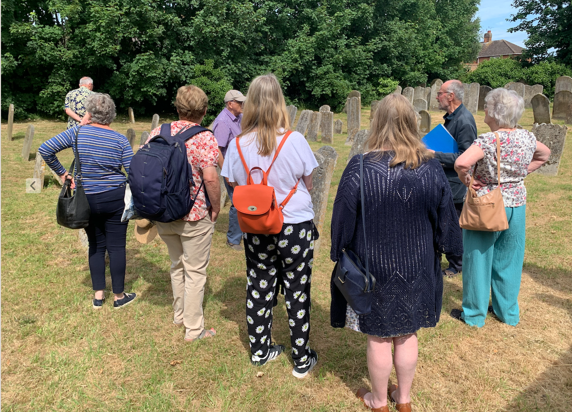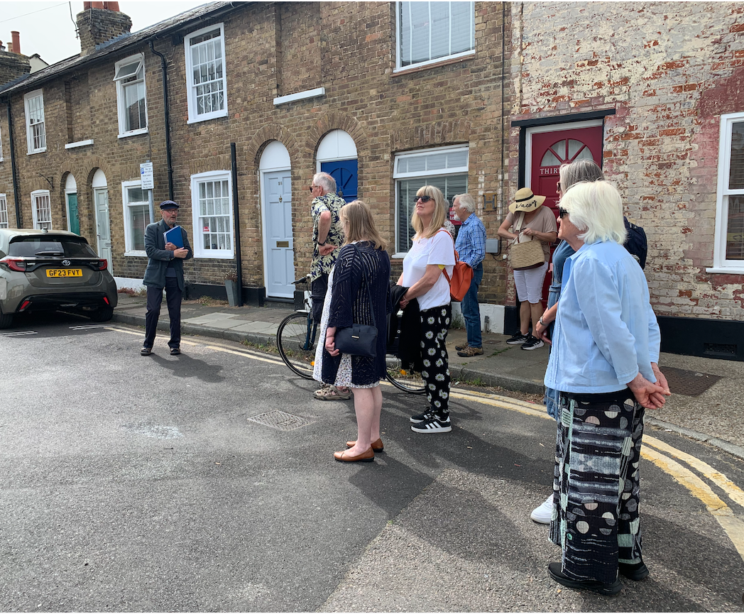 All CHAS members will be familiar with various iconic buildings in or around the St Dunstan’s area including the Westgate Towers, St Dunstan’s Church (images 1 and 2) and the Roper Gateway (image 3). But perhaps some CHAS members have not visited the former Jewish cemetery (Image 4), and it really requires the knowledge and skill of a long-time St Dunstan’s resident and guide (Peter Berg) to reveal many interesting places and buildings in the area, and to recount fascinating stories from the past. Access to the old Jewish cemetery is now via a key kept by the city council. However the council has been moving offices, and when Peter requested the key, initially it could not be located. Finally it was found just in time for our tour on June 29th, so Peter was able to show us the beautiful cemetery, and share his knowledge of the Jewish calendar to enable interpretation of some of the dates to be seen on the headstones. Other places of interest included a former pub in Cross Street (image 5), an art deco building of a former shoe repair shop (image 6) the former home (image 7) of Frederick Flint (owner of the adjacent Flint & Sons Brewery) and the cover (image 8) to the coal bunker (now used to store something more palatable) outside Peter’s own home. Another architectural gem is Aucher Villas designed by the former local city surveyor and architect John Hall Green, and many CHAS residents will have seen the new blue plaque outside his former office in St Margaret’s Street. Peter finished his walk with a short quiz, and it is pleasing to report that nearly all the questions were answered correctly indicating how keenly CHAS members had been listening throughout the afternoon.