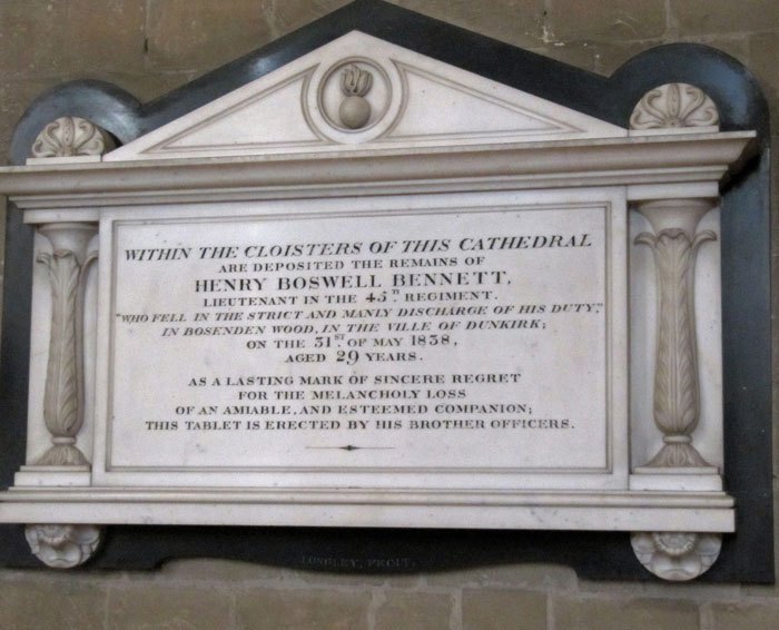 In 1838, 29 year old Lieutenant Henry Bennett, of Irish parentage, was serving with the 45th Regiment of Foot (Sherwood Foresters) in Canterbury. He led a unit called to deal with the last armed insurrection on English soil – that of the Cornishman John Nichols Thom, also known as ‘Mad Thom’ or as he preferred ‘Sir William Courtenay, Knight of Malta and King of Jerusalem’. Thom, who had suffered from serious long term mental instability, was leading the revolt of a small band of local rural workers. He shot Lieutenant Bennett dead on 31 May in Bossenden Wood (spelt with one ‘s’ on the memorial stone) near Hernhill, and was duly shot dead himself by soldiers. Bennett thus became the first officer to die in the service of Queen Victoria. On 2 June 1838 he was buried with full military honours in the cloisters – the event attracted six thousand spectators. Given the special circumstances, the Cathedral authorities waived the normal ban on firing of guns in the precincts and permitted the firing of three volleys over Bennett’s grave. One writer has described Bennett as ‘young, inexperienced, impetuous, and thirsting for martial glory and promotion’ (Rogers (1962). Had he withdrawn for just a few minutes to wait for colleagues to arrive in support, Thom might have seen the hopelessness of his situation and surrendered. Thom’s surviving followers were captured and received a range of sentences: two to death but reprieved to be transported for life; one transported for 10 years; and six to prison for one year with one month in solitary. Bennett’s father, Major Bennett, with 39 years’ service, applied for, and was granted, a small increase in his pension to help him bear his loss.