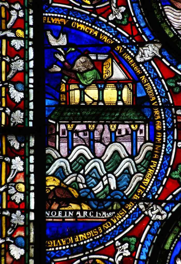The right hand window does not have a common theme as most of the glass comes from different windows, although several scenes relate to miracles. The second scene from the top in the middle shows the marriage feast at Cana with the pots of water in the front about to be changed to wine. On the left near the bottom there is a scene of Noah in his Ark, labelled ‘NOE IN ARCA’, in a very choppy sea receiving an olive branch from a returning dove.