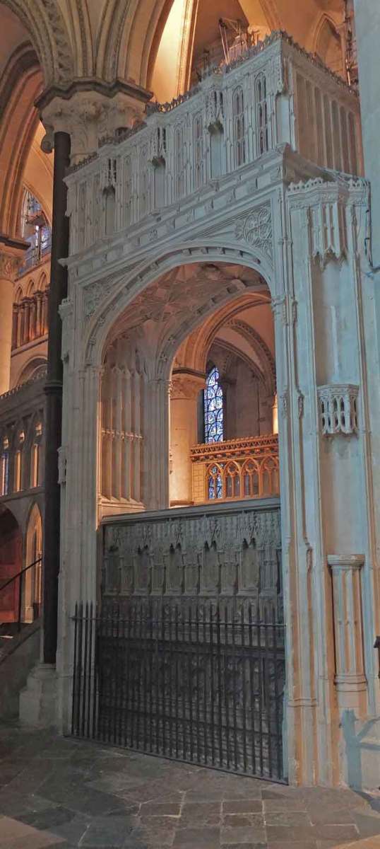 Thomas Bourchier (pronounced Bowcher) 1404-1486 was a grandson of Edward III held a variety of senior posts (Chancellor of Oxford University, Bishop of Worcester and later of Ely) before becoming Archbishop of Canterbury in 1454. He became a Yorkist supporter and crowned Edward IV in 1461. The tomb has no effigy and was designed to allow light to shine through to the area of the altar. Its chest appears exceptionally high when viewed from the north aisle (as in the photo) but this is mainly to compensate for the higher floor level on the Sanctuary side.