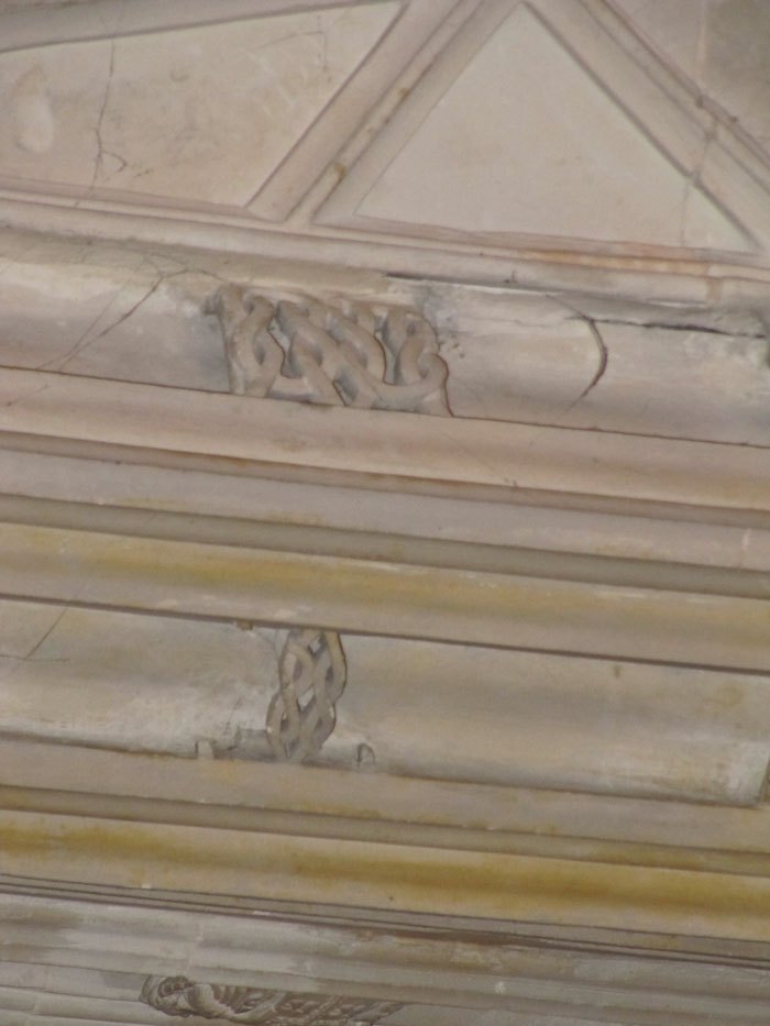 - the rebus of butcher’s knots (the French for butcher is boucher, and anyway butcher sounds like Bowcher) can be seen here in various forms on the stone work, together with a second rebus of twigs and leaves depicting ‘Woodstock’, the family of Bourchier’s mother, Ann of Gloucester (Image 2)