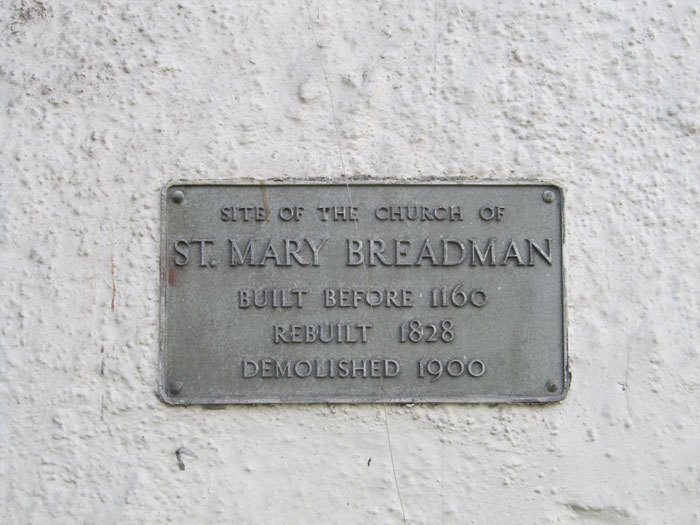 The open space next to Nasons store in the High Street was once the church of St Mary Breadman – first mentioned in the late 12th century and named after the nearby bread market to distinguish it from three other St Mary dedications in the city. The church was rebuilt in 1828 but demolished in 1900. Several memorial stones have been set into the paving of the small remaining square.