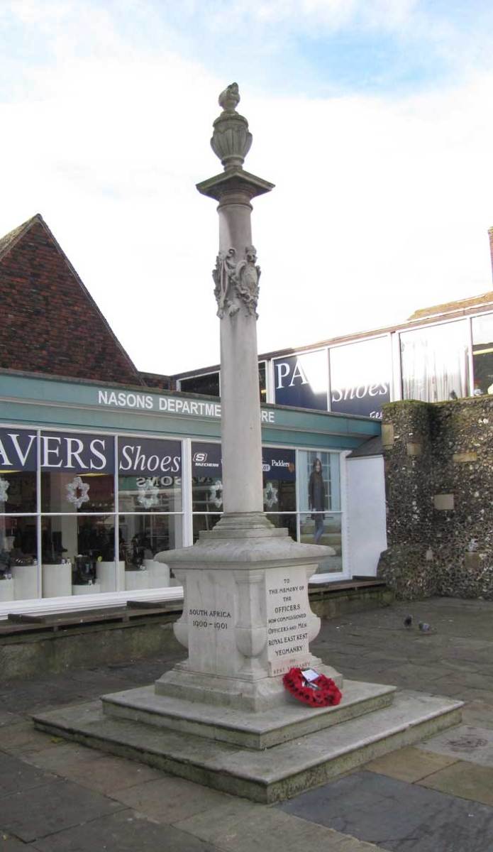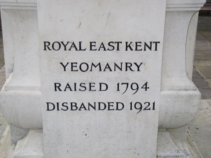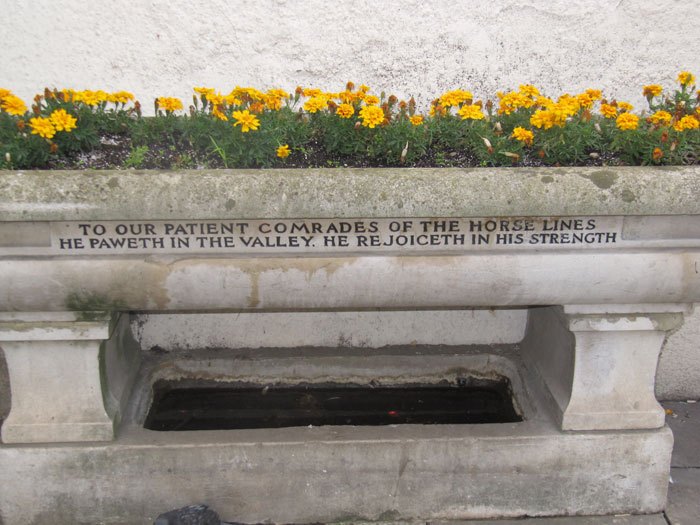 Apart from a small plaque reminding us of the church, this site now includes the memorial cross to the Royal East Kent Yeomanry (known as the Buffs) and an accompanying horse trough. Both were removed from the old city cattle market where they had been unveiled by Lord Harris in October 1922 to mark the disbanding of REKY after over 120 years of service. The relocation was needed to make way for the new city by-pass in the 1960s. The urn and flame on top of the column denotes undying fame, whilst the broken spurs on the regimental badge recall transition from a cavalry to an infantry regiment. Memorial horse troughs are rare – the text reads ‘To our patient comrades in the horse lines’ with a quotation from Job 39 v21 ‘He paweth in the valley He rejoiceth in his strength’.