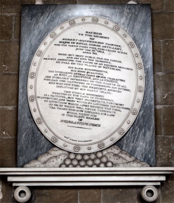 Major Robert Macpherson Cairnes was an artillery officer during the wars against Napoleon, mostly serving in the Peninsular War, and was killed in the thick of the Battle of Waterloo. His monument in Canterbury Cathedral (Images 1,2) is on the north wall of the nave. It has an inscription on an oval plaque toppling over on cannonballs set amidst a battlefield. The memorial is supported by two brackets in the shape of cannon mouths (Image 3). It all suggests that his was a life cut short by the deadly vagaries of his profession.