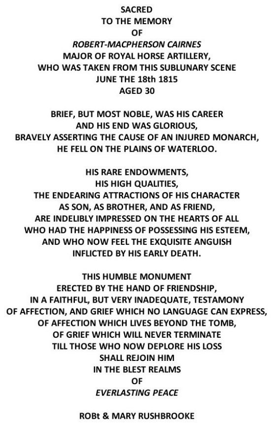 Cairnes’ Canterbury memorial was executed by Thomas White Longley, the cathedral’s master mason. It is also signed by Robert and Mary Rushbrooke – probably Robert Rushbrooke (1752-1829), a barrister, and his wife Mary Rushbrooke, nee Grubb, (1755-1844), of St George’s Street, Canterbury. There is another monument to Cairnes in the church of St Francis in the town of Waterloo, erected by Burke Cuppage, probably Cairns’ half-brother, who had fought at Waterloo as an artillery lieutenant. Cairnes is also named on the monument in the same church to all of Wellington’s artillerymen killed in the battle.