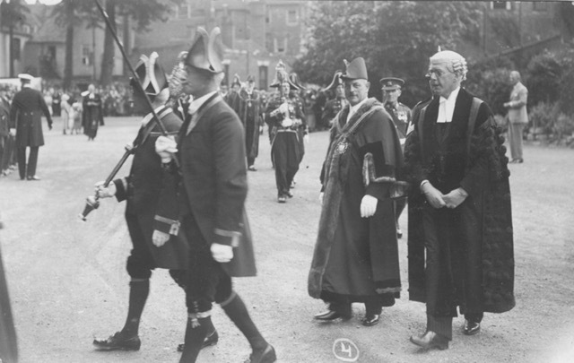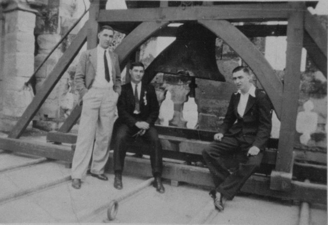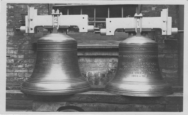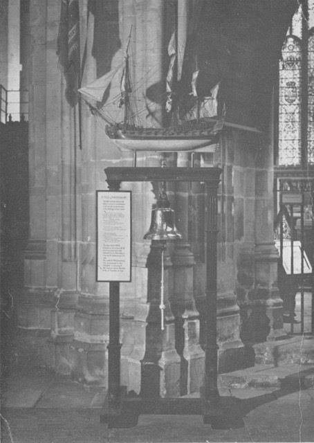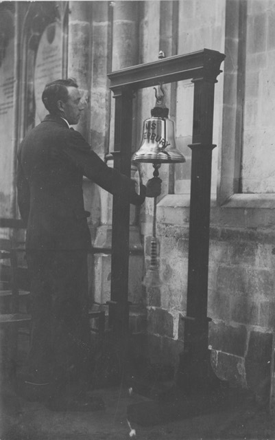 Further below are images of 5 postcards from the Derek Butler collection. The first image (thought to be from the 1930s) shows Bell Harry with three people. CHAS would be grateful if any website visitors can identify any of these individuals. The second postcard is dated 1923 and shows 2 bells cast to commemorate change ringers who died during WW1. The third image shows part of a mayoral procession of 1934 when HMS Canterbury bell was donated to Canterbury Cathedral. And there are two further images of HMS Canterbury bell (images 4 and 5)