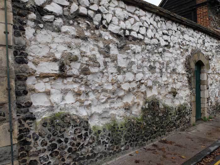 Chalk hills extend across the county of Kent, from Dover to Gravesend, but most of the surface chalk is of a soft and porous quality, unsuitable for unprotected external work. The first example below shows how the medieval city walls, constructed in the 1380s, relied on a hard flint surface (much of which is now lost) to protect the internal blocks of chalk. The second provides a rare example of internal medieval walls showing a jumbled mix of chalk, flint and other stones.
