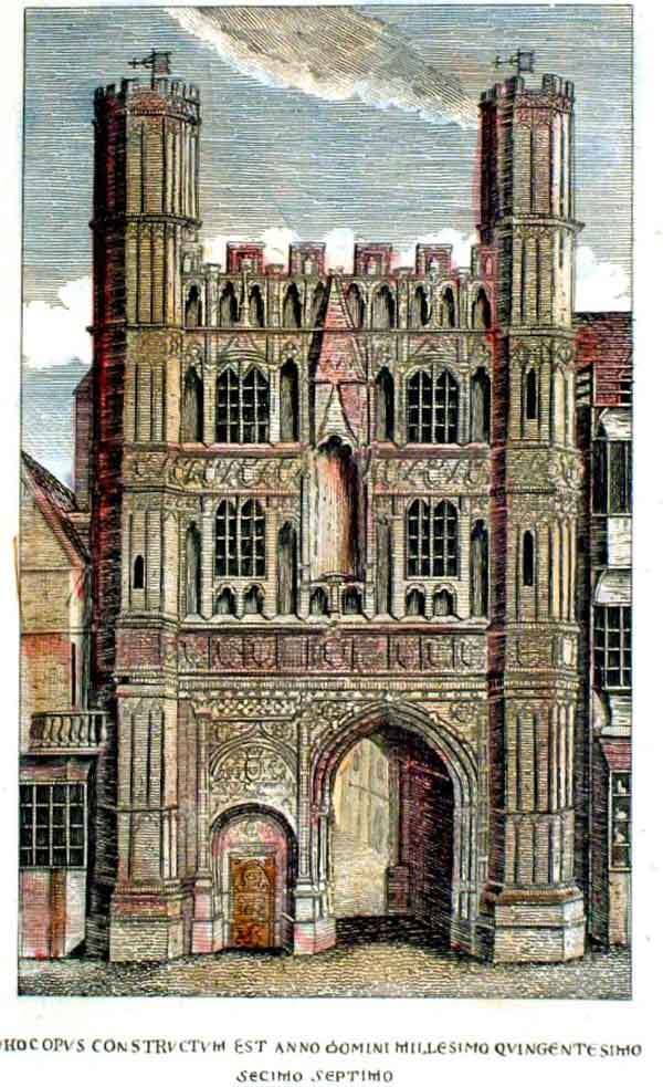 - The gate today constructed with a stone four centred arch and two stone faced brick stories above, surmounted by two octagonal towers , all decorated with blind perpendicular tracery (Image 3).