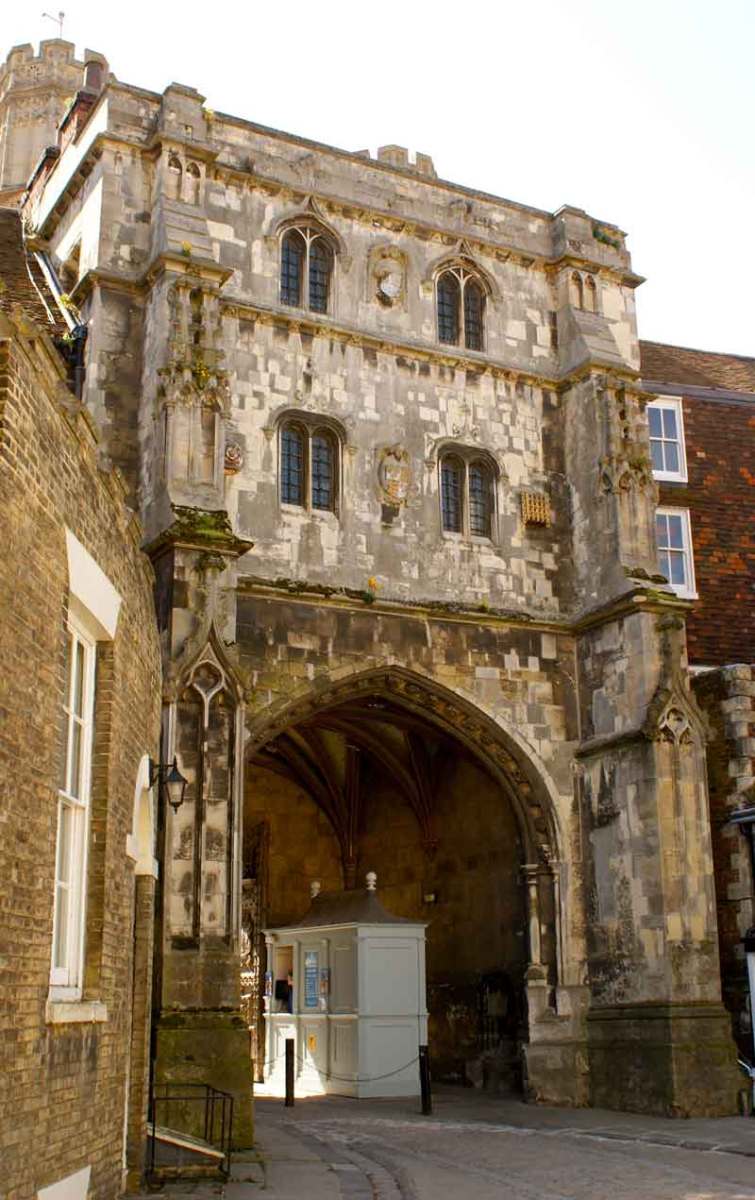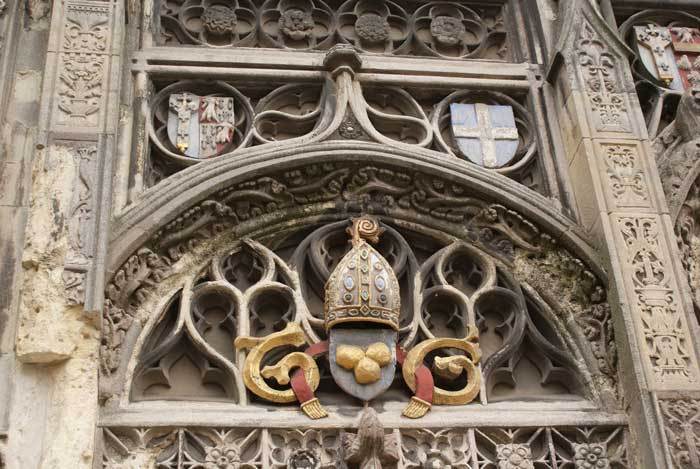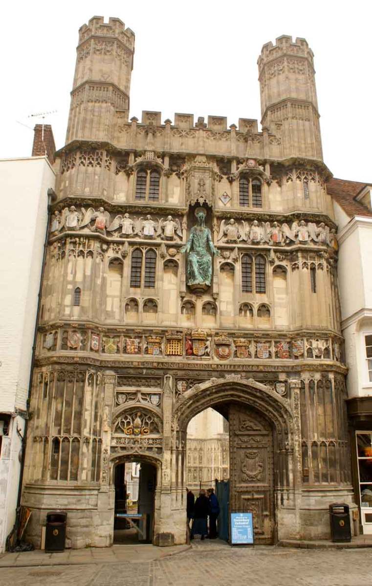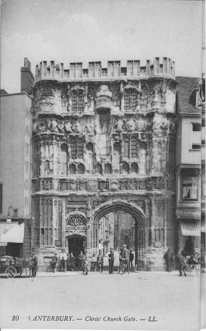 Cathedral records,indicate the gate was built between 1504 and 1521 with funds provided by Priors Goldstone and Goldwell. This is despite the inscription of 1507 on the stonework “Hoc Opus constructum est anno Domini millesimo Quingentesimo decimo septimo,” – a matter of ongoing dispute between historians. It was probably built in honour of Prince Arthur, Henry VIII’s elder brother who married to Catherine of Aragon in 1501. He died the following year aged just 16, allowing Henry VIII to become King and marry Katherine himself in 1509. Imagine the consternation of the sculptors responsible for the heraldry trying to keep up with changing family dynamics! The original statue of Christ and the wooden gates were destroyed by the Puritan iconoclast Richard Culmer in 1643. The gates were restored by Archbishop Juxon in 1660 and still bear his arms. The original towers (Image 1) were torn down in 1803 (Image 2) by Jesse White, the surveyor to Cathedral, at the request of Alderman James Simmons. He wanted to see the Cathedral clock from his bank Simmons & Gipps, now the Lloyds Bank building on the High Street! The towers were replaced in 1937 during another restoration, this one funded by Dame Janet Stancomb-Wills (of the Wills tobacco family) and her sister. The statue of Christ was replaced in 1990 after a gap of 347 years.