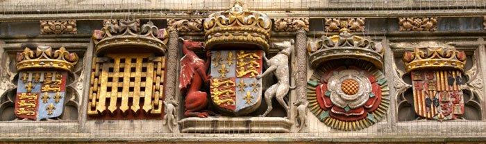 - Arms of Tudor Dynasty including (centre) the royal arms supported by the Welsh Dragon and the white greyhound of Henry VII’s father Edmund Tudor, (left) the Prince of Wales outside the Beaufort portcullis and (right) Spanish history in the arms of Catherine of Aragon (red and yellow of Aragon, castle of Castille, lions of Laon, eagles of Sicily and the pomegranate of Grenada) outside the Tudor rose (Image 4).