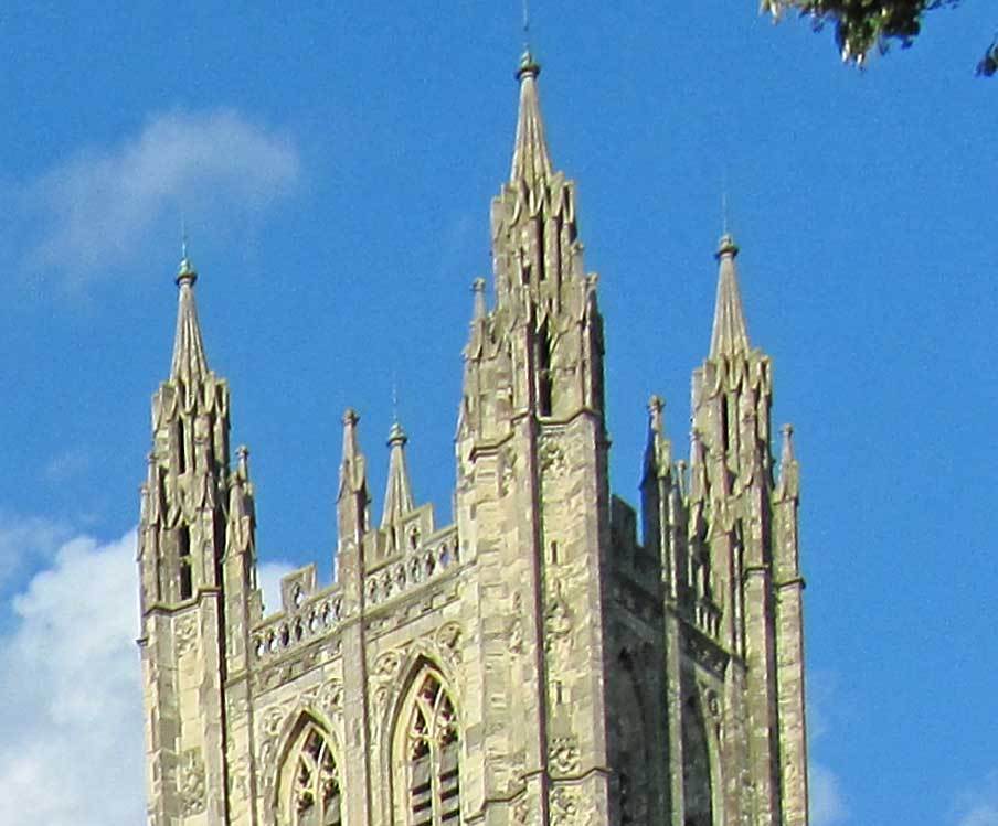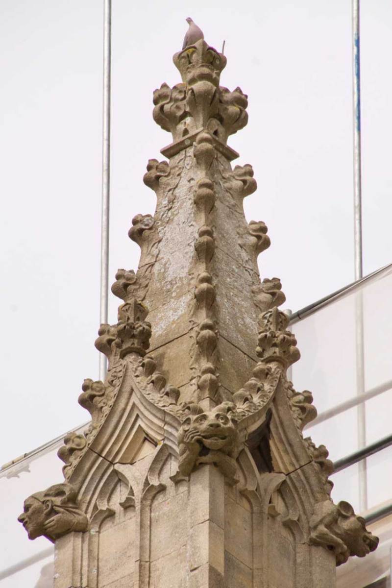The troubled history of Doulting Stone at the higher levels of the cathedral fabric make it difficult to point to specific examples, particularly as some has since weathered badly and been replaced. As mentioned above, it was apparently used by William Caröe (and his son) for repairs to the SW tower (1912) (image 1 below) , to the Bell Harry pinnacles (1903-1908, image 2 below), and to the nave aisle pinnacles (in 1912, images 3 and 4). There is also evidence of use of the stone in the Candle Tower and in the Arundel Tower where it replaced decayed Caen Stone. For a nearby example of Doulting Stone that is more certain and more accessible see the War Memorial (image 5) that stands immediately outside the Christ Church gate.Note the faces (animal and human) at the base of the pinnacle.