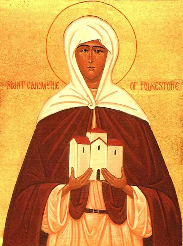 There are scant details about Eanswythe’s life but it is believed that she founded a nunnery at Folkestone around the middle of the 7th Century. According to the account of a monk (writing in the 13th Century) Eanswythe wished to lead a religious and chaste life and chose Folkestone as being remote from society. Her father, or more likely her brother King Earconberht, built 2 churches on the site, a private oratory near the cliff’s edge, and a church of Saint Peter further inland, along with buildings for the nuns.