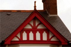 An eclectic style with influences from Mediaeval, Tudor, Georgian, Arts and Crafts and Art Nouveau, while public buildings often had Baroque touches. A wish for space and solidity brought angular double-height bay windows with leaded lights and large gables that were front-facing and timber-heavy. Porches, often attached to a veranda with turned woodwork, had tiled floors and walls and there were coloured glass panels in wide front doors. Exterior decorative details were popular using terracotta, plasterwork, patterned brickwork, tiles and rendering.