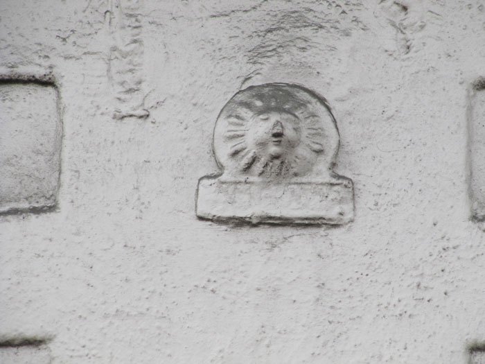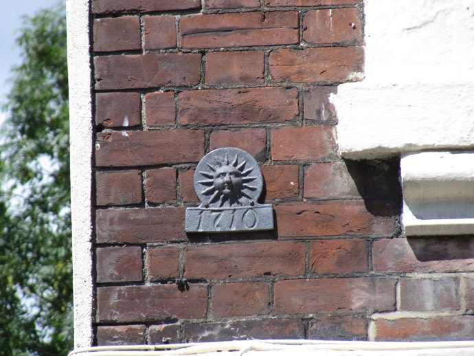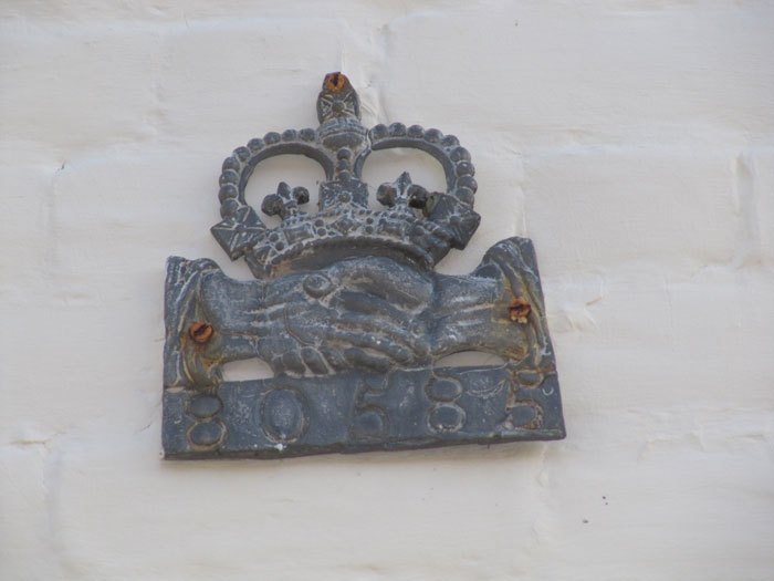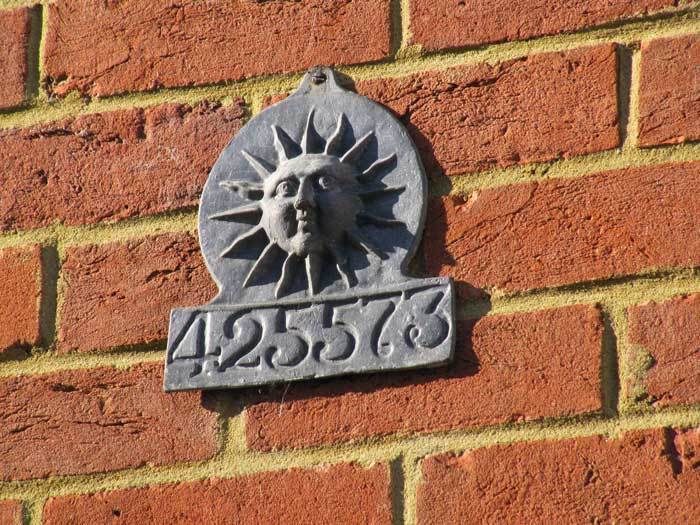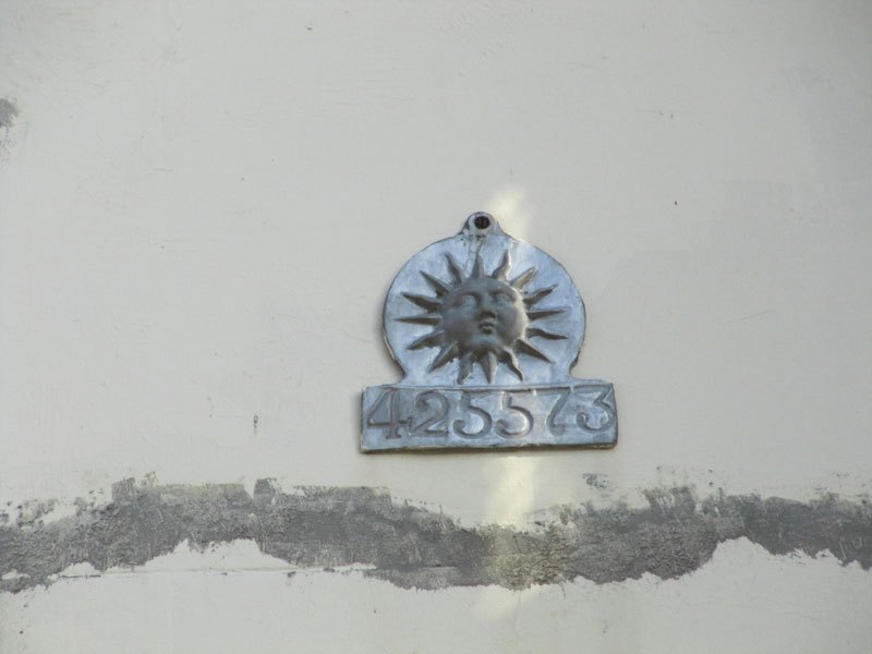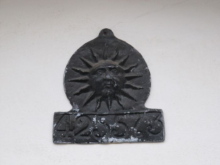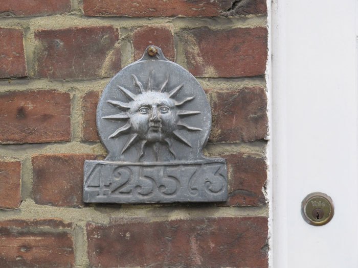 Our hunt for fire marks has had limited success – nine are shown in the photos (Images 4 to 12), all but Image 12 showing the Sun Fire Office motif. Some look too new to be original marks, and several show the same policy number, suggesting that they are recent additions. The only company other than Sun is the Hand in Hand emblem in Prospect Place (Image 12).