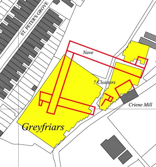 - Cokyn’s Lane forms the western edge of the site and is now inaccessible, but was once the road extension of the walking place, a feature unique to Franciscan churches between the chancel and nave. The wall of the lane still contains the remains of the chancel screen. The end of the road once terminated in a north gate to the friary (demolished 1595), now only a derelict entrance (Image 9).