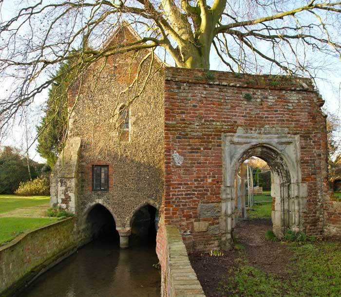 Greyfriars is an unexpected haven of peace and tranquility right in the heart of the city (Image 1). The entrance (a small charge applies) is from a shop front on St Peter’s Street. It was the site of an extensive friary (Image 2) between two arms of the River Stour, but now only a small chapel bridging the river remains, surrounded by open meadows and lawns.
