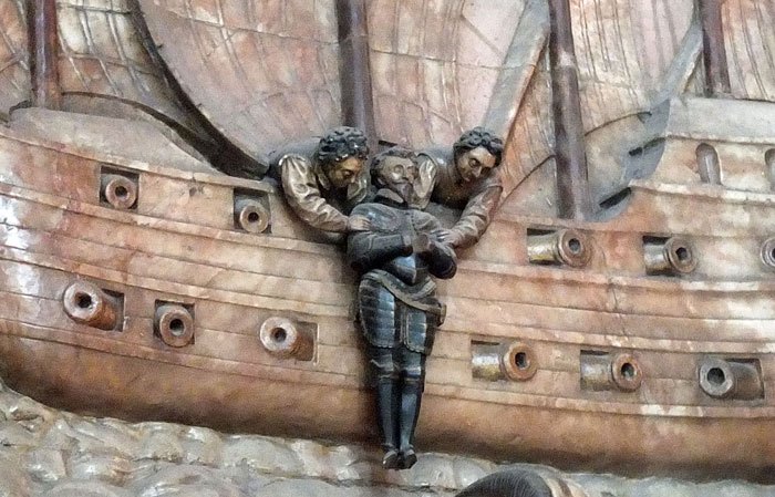 - the grandson, another Sir James Hales, died at sea following the attack on Cadiz in 1589, a reprisal for the Spanish Armada attack the year before – he is shown here as an armed figure being lowered into the water (Image 2 – the only example of such a scene in English cathedrals)