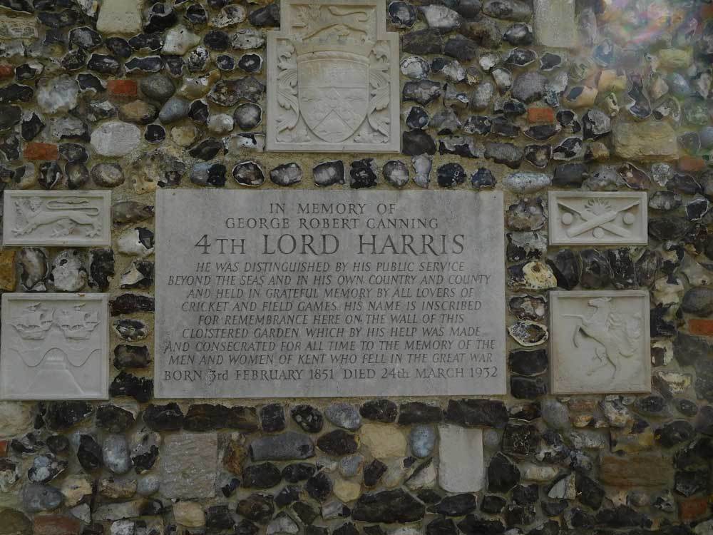 The visitor can access the War Memorial garden either from the Queningate (NB this needs a cathedral pass) or from the south Precincts, via steps and an open gateway. On the flint wall beside the steps (right hand side when entering) several stone tablets commemorate the life of George Robert Canning Harris. NB several Lord Harris’s, livng and dead, have made major contributions to British life. Note also that ‘Bomber Harris’ (of Bomber Command) became a baronet but not a Lord.