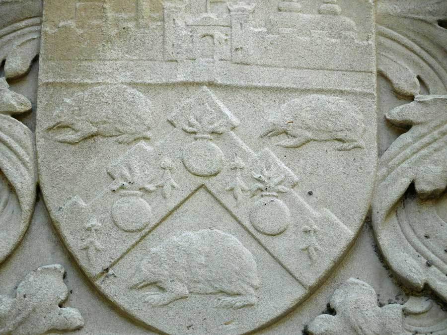 The stone immediately above the main central stone shows an heraldic shield that includes three small creatures which look like hedgehogs. The link to the Harris family is simply a play on words – the French for hedgehog is ‘hérisson’ which sounds (a bit) like Harris, or perhaps Harris-son as George was son of a Harris? In heraldic terms this is known as ‘canting’.
