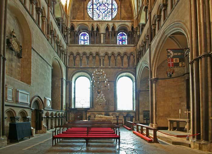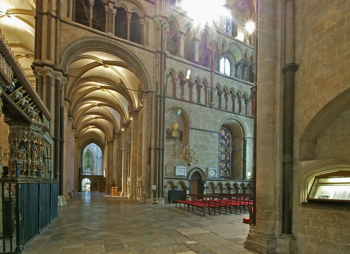 This viewpoint covers the north aisle of the choir, the north east transept, and St Andrew’s chapel. The north east transept lower walls were completed around 1106 by Archbishop Anselm and Prior Ernulf, but raised after the 1174 fire to their present heights by William of Sens in the 1170s.