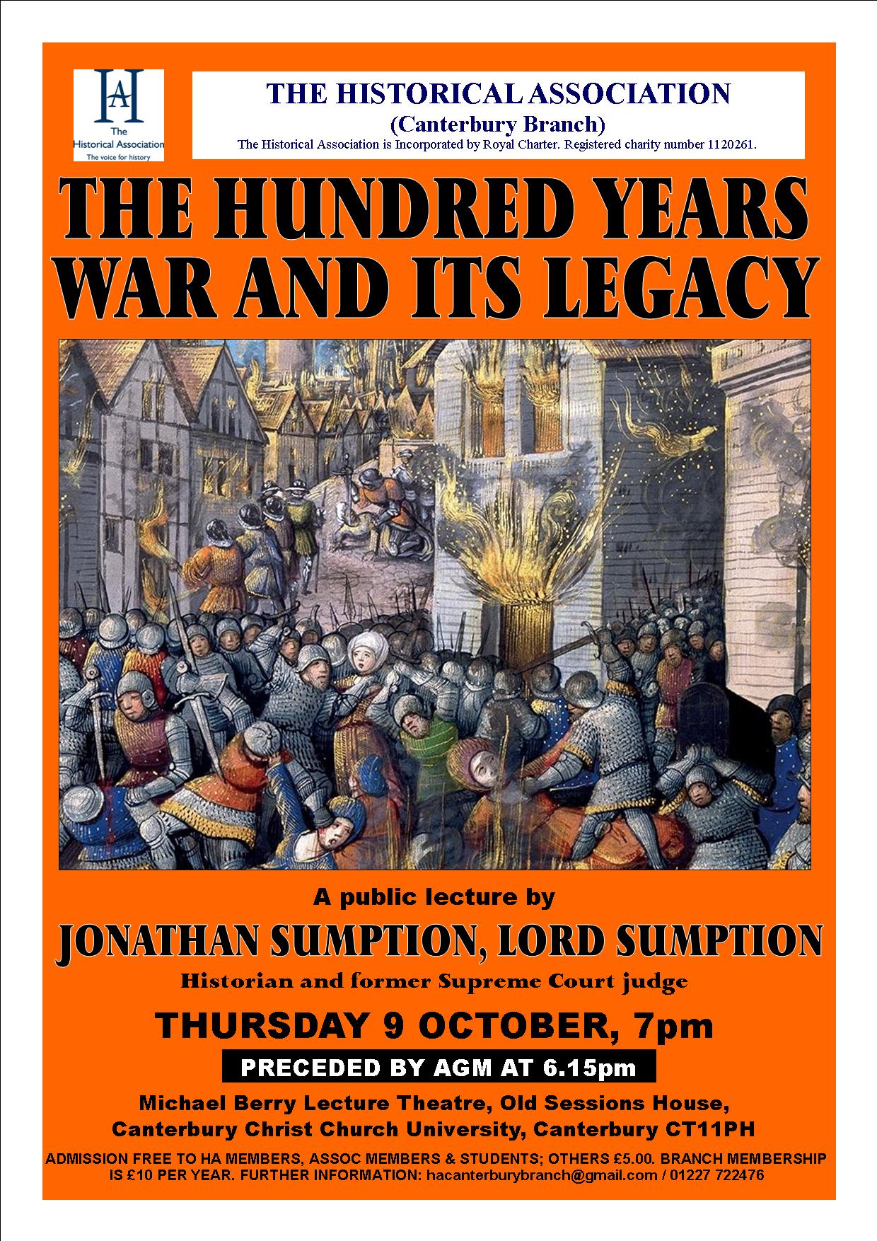 Thursday, 9th October 7:00pm (preceded by AGM at 6:15pm) at Michael Berry Lecture Theatre, Old Sessions House, Canterbury Christ Church University, Canterbury CT1 1PH. Talk on “THE HUNDRED YEARS WAR AND ITS LEGACY” by Jonathan Sumption, Lord Sumption. Admission £5 (or free for members of the Historical Association). For further details please click here.