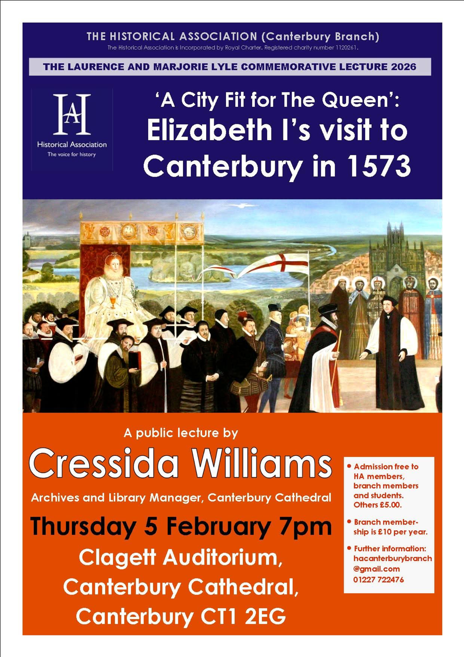Thursday, 5th February 7:00pm Clagett Auditorium, Canterbury Cathedral. Cressida Williams, Archive and Library Manager, will talk on “A city fit for the Queen: Elizabeth I’s visit to Canterbury in 1573”. Admission is £5 (free for members of the Historical Association). For further detail please click here