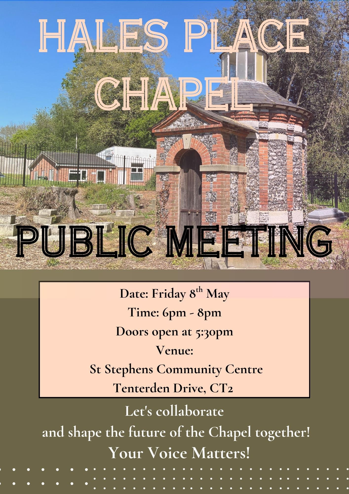 Friday 8th May 6:00pm St Stephen’s Community Centre, Tenterden Drive, CT2. Public Meeting and talk on Hales Place Chapel. Doors open at 5:30pm for refreshments. For further details please click here