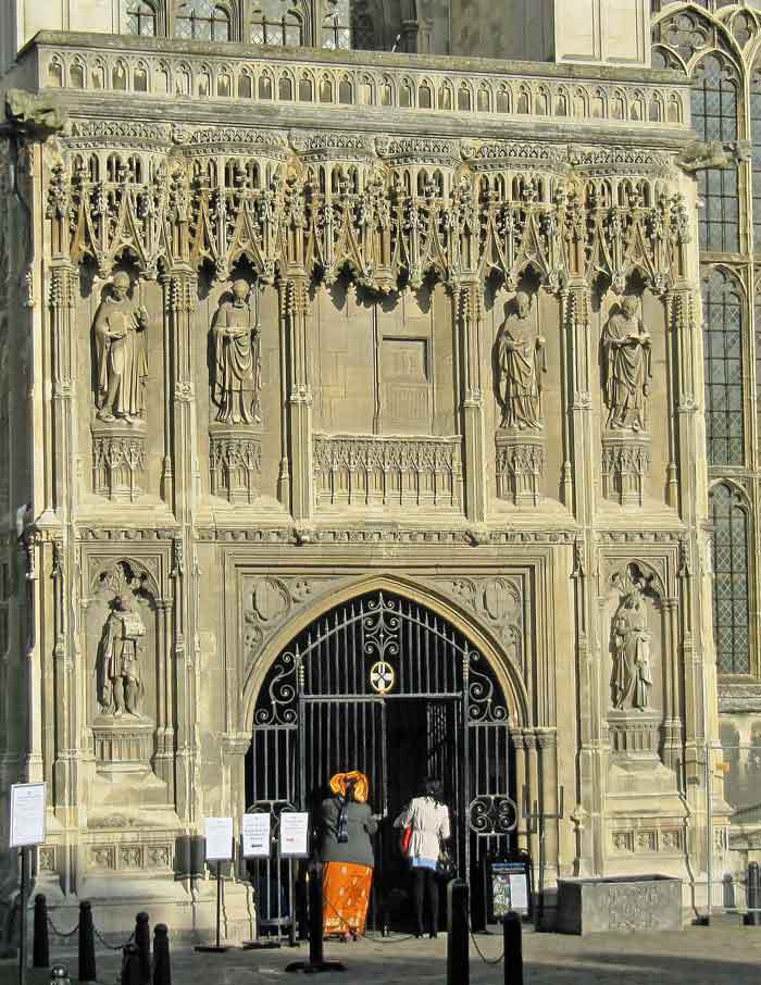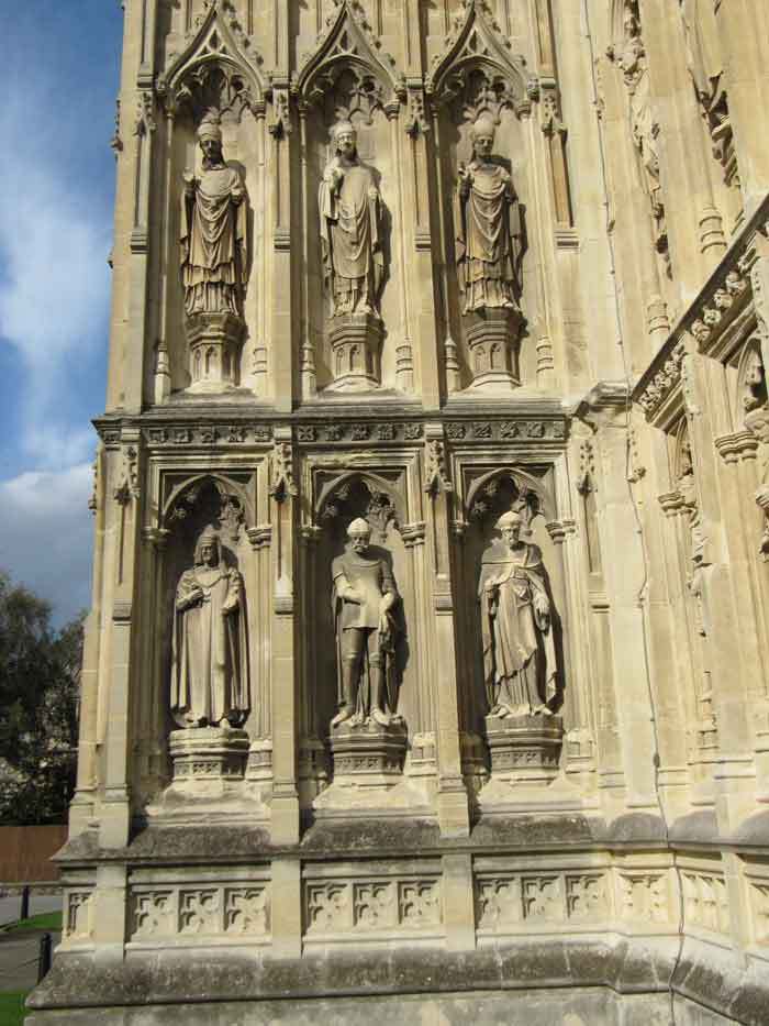 - figures on the south face of the south west porch, including Augustine, Lanfranc, Anselm, Cranmer, Ethelbert and Bertha (Image 1)