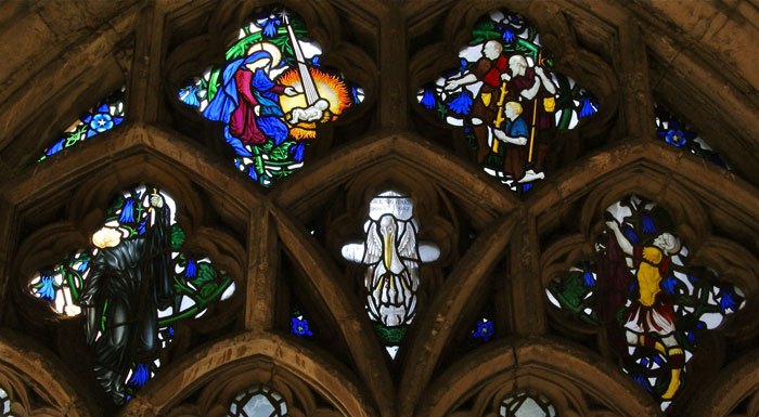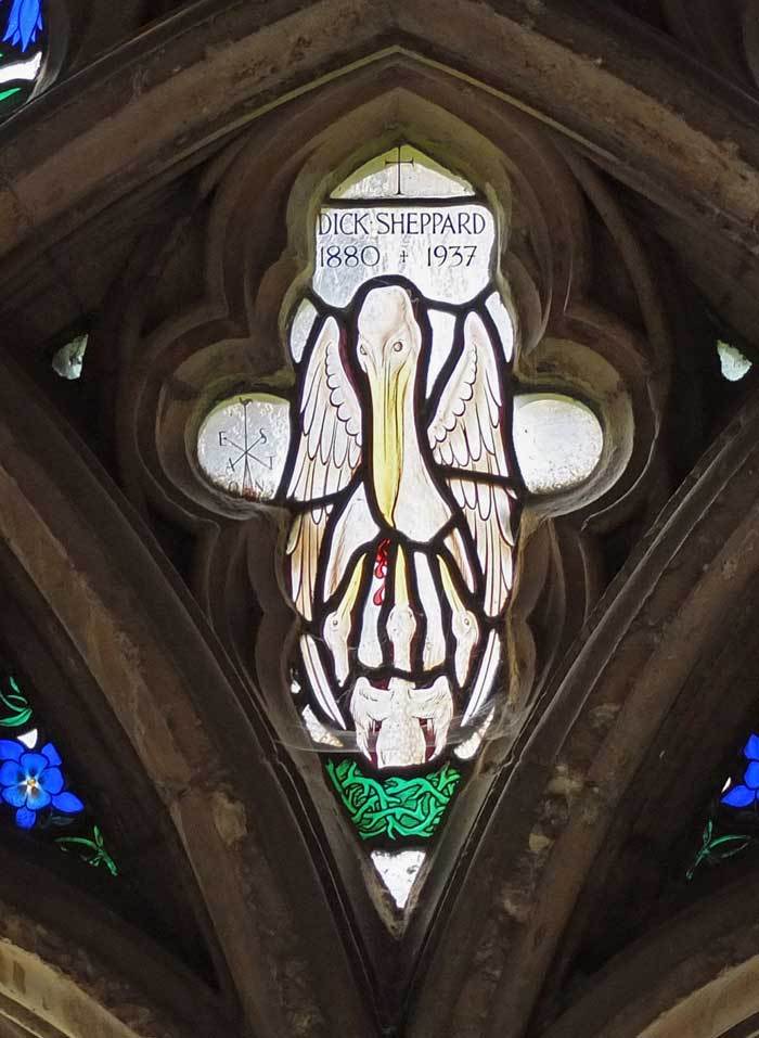 This window in the cloister west walk was made in 1939 by Hugh Easton (1906-1965), in memory of Dean Richard (Dick) Laurie Sheppard (1929-31). Easton’s best known works are those made for the Battle of Britain Chapel in Westminster Abbey.