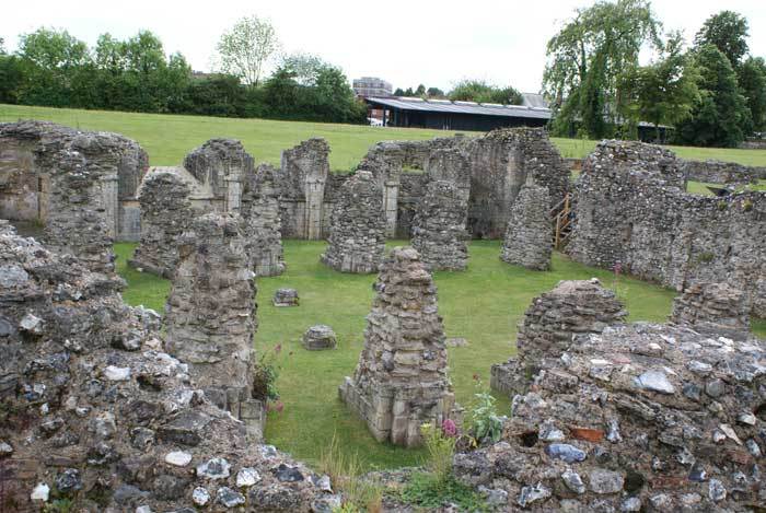 - The view across the ruins of the refectory and cloister to the modern building beneath which the Archbishops of Canterbury were originally buried (Image 12).