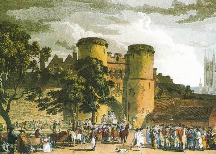 In the 10th century a new city main street was formed by demolishing the shambles at the eastern end of the direct line between Westgate and a newly formed gate, creating the streets now known as High Street and St George’s Street. This gate naturally became Newingate (from the Anglo-Saxon ‘aet thaem neowan gate’ – at the new gate) and was probably of simple arched form at first, leading to a cattle market called Rithercheap.