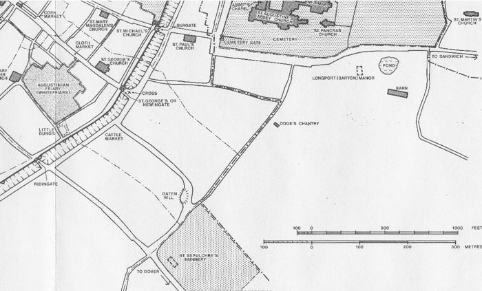 By 1754 the drum towers held the reservoirs for the city’s water supply, but the doors were removed in 1785 and the whole Gate demolished in 1801 to provide more traffic capacity to a new turnpike road to Dover (now New Dover Road) that had been opened in 1790. The reservoir was moved to the nearby bastion tower on the city wall which currently accommodates the Zoar Chapel. Previously traffic to Dover had to turn right and access the Old Dover Road, originally the Roman Watling Street via Riding Gate, via Dover Street. Traffic to Sandwich had to turn left and access the road to Sandwich through Burgate via Ivy Lane (Image 3).