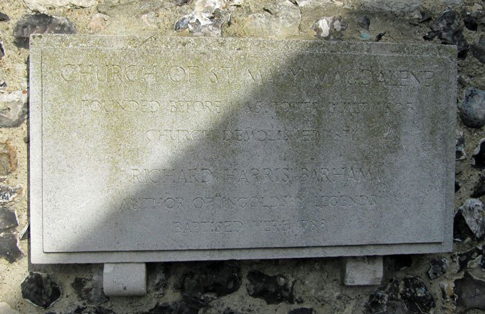 - Two plaques on the outside walls of the tower giving basic history and dates – one also notes the baptism of Richard Harris Barham here in 1788 (Image 2)