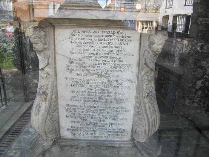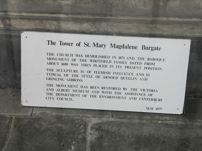 - The memorial to John Whitfield housed behind glass in the tower and floodlit at night – a remarkable Canterbury benefactor who claimed to have invented the fire engine (Image 3 and 4)
