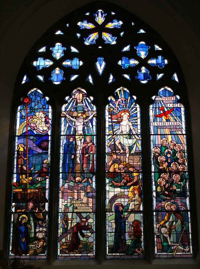 - The modern east window retaining below a brass dedication plaque to John Chessyre to whom the previous window destroyed in World War II was dedicated (Image 4).