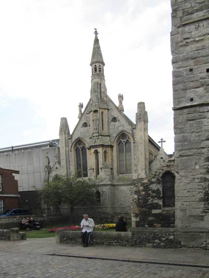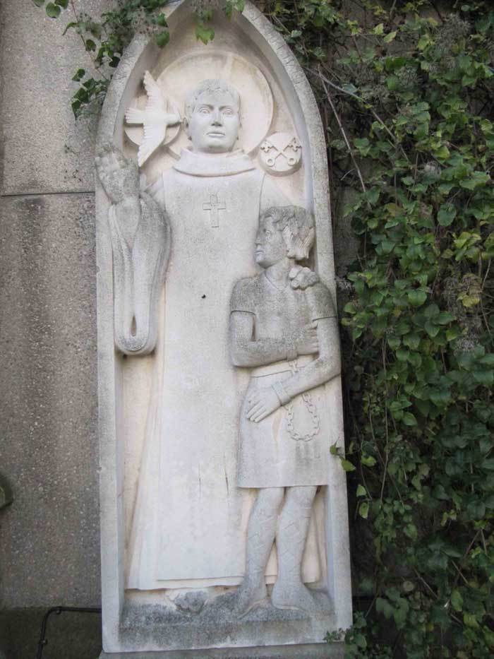 - The large stone relief to the right of the central tower depicting Pope Gregory and an Anglian slave (Image 2). (Gregory before he was Pope was impressed with the fair complexion of Anglian slaves and remarked ‘Angels not Anglians’) This originally stood in St Gregory’s chapel Chartham but on the closure of St Augustine’s Hospital in 1994 was transferred to Canterbury. Here, it was blessed in 1997 by the Archbishop of Southwark to mark the 1400th anniversary of the arrival of Augustine in England