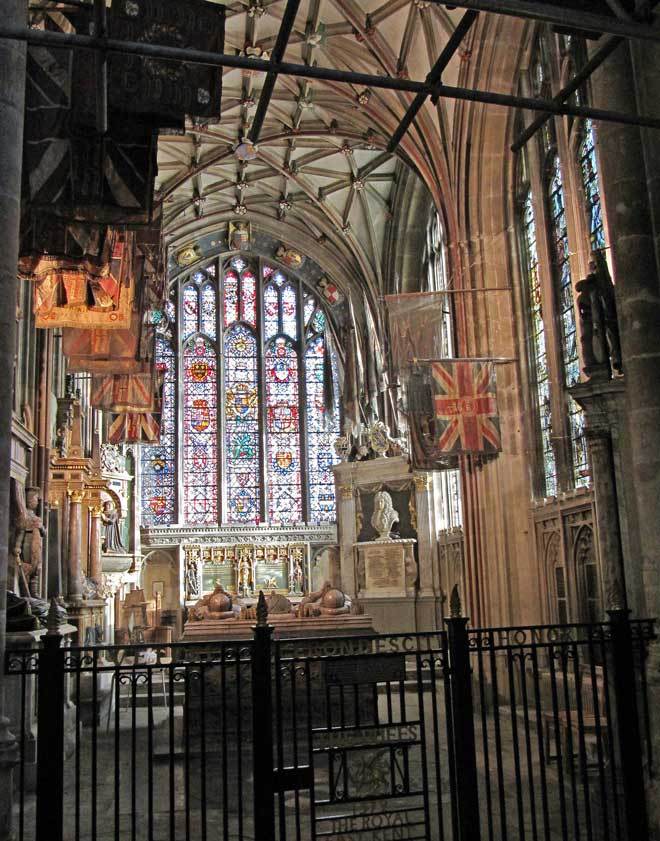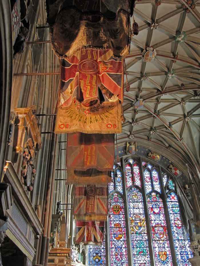 - in the overview from the south west transept (Image 1) you cannot miss the very large triple tomb in the centre (to the wealthy and influential Lady Margaret Holland and husbands), the large collection of regimental flags, the east window and the lierne vaulted ceiling (more below on each of these)