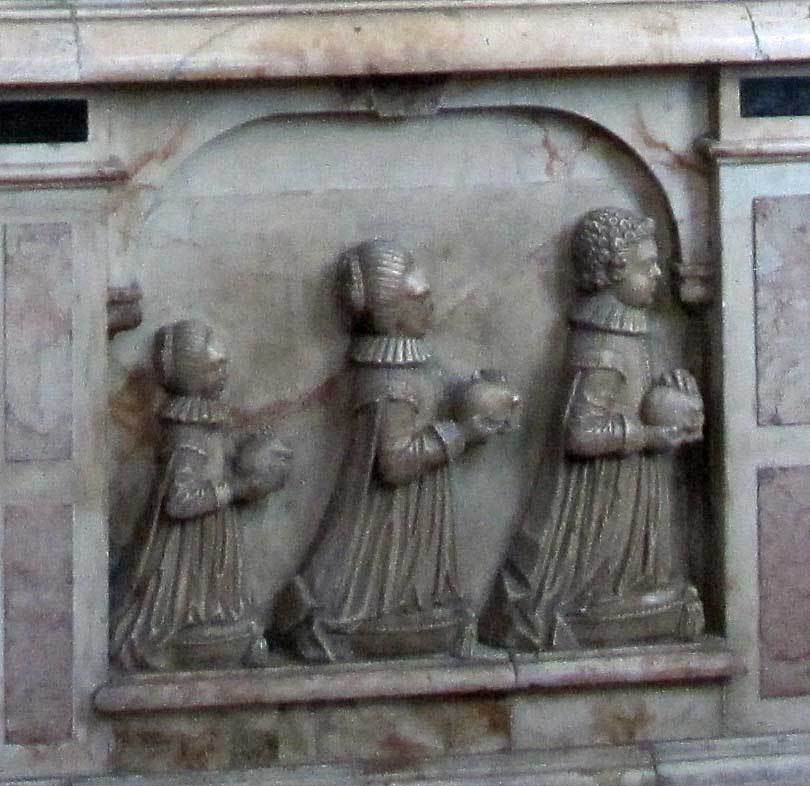 - the next memorial on the north wall, moving east (Image 11), shows the kneeling figure of Sir Stephen Baker of Sissinghurst (died 1616), third husband of Mary, Lady Thornhurst – note his large neck ruff, small wrist ruffs, leg armour and padded trunks – below him lies his wife Lady Thornhurst, in what has been called the ‘toothache’ attitude (hand on cheek) wearing a ruff at her neck, stomacher, tightly fitting bodice, her hips clearly extended by farthingales, her wrists showing six-buttoned turn-back cuffs – she died in 1609; weepers below – now sadly headless – are their two daughters ‘The Lady Grisogone Lenerd and the Lady Cicely Blunt’