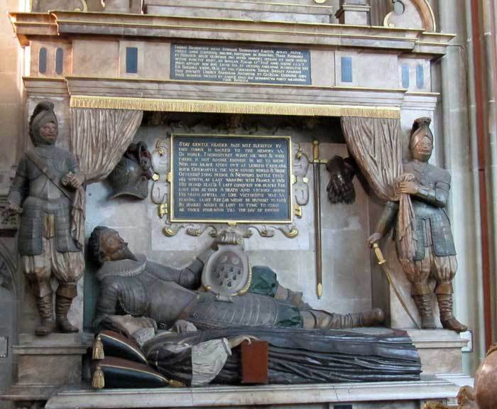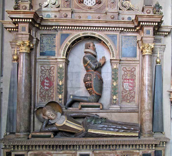 - also on the north wall, Thomas Thornhurst lies recumbent on one elbow, his helmet, sword and gauntlets on the wall above (Image 9) – he died during the English (unsuccessful) invasion of the French Isle de Ré (1627); beside him lies his wife Dame Barbara (died 1639), her head resting on a double cushion and her hand on a book