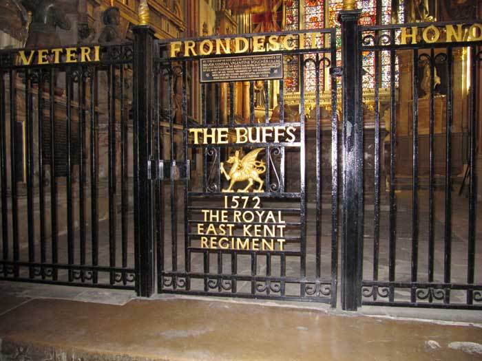 - the chapel gates (Image 2) remind visitors of the links between the city, the cathedral and the Buffs – the Latin motto across the top of the gate “Veteri Frondescit Honore” can be translated as “Its Ancient Honour Flourishes”; the east window (visible in Image 1) replaced the ‘Crimea window’ which was destroyed by enemy action in World War II – the arms of colonels of the Buffs since 1665 are represented in the window and surrounding stone shields
