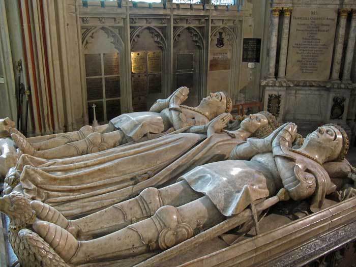 - The large central tomb (Image 4) consists of a Purbeck marble chest topped with three alabaster figures – Lady Margaret Holland (died 1439), granddaughter of the Fair Maid of Kent, lies with successive husbands John Beaufort Earl of Somerset (died 1410) on her left and Thomas Duke of Clarence, grandson of John of Gaunt (died 1421) on her right. Margaret died only 11 days after completion of the chapel, and, in line with her wishes, the remains of both husbands, then elsewhere in the cathedral, were reburied beside her.