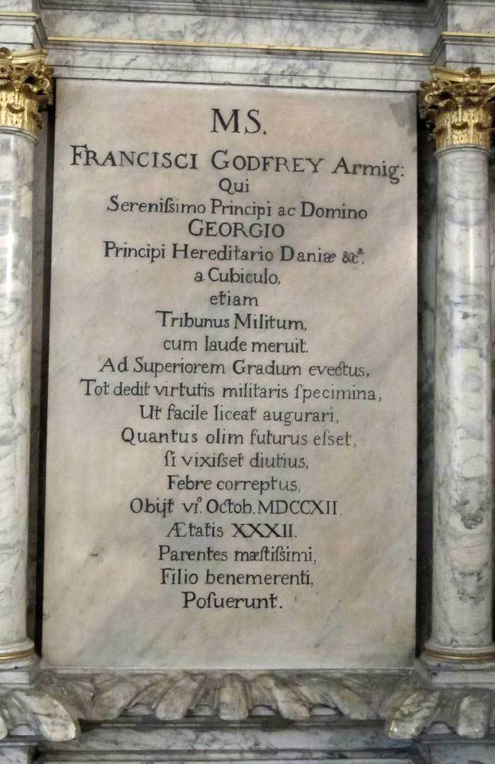 - Brigadier Francis Godfrey (died 1712) has a memorial in Latin in the south west corner of the chapel (Image 7) – he served as ‘groom of the bed chamber of Prince George of Denmark’ and the lower section of the memorial (not visible in Image 7) shows a striking hour glass and a skull, each in green garlands