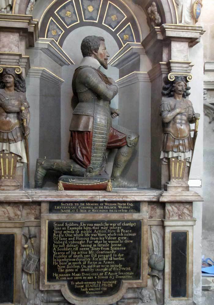 - on the north wall, Lt Colonel William Prude in armour kneels on one knee on cushion (Image 8) – he had local connections (married Mary Spraklinge at St Paul’s Canterbury in 1606 and had 7 children with her) and was killed at the siege of Mastricht July 1632