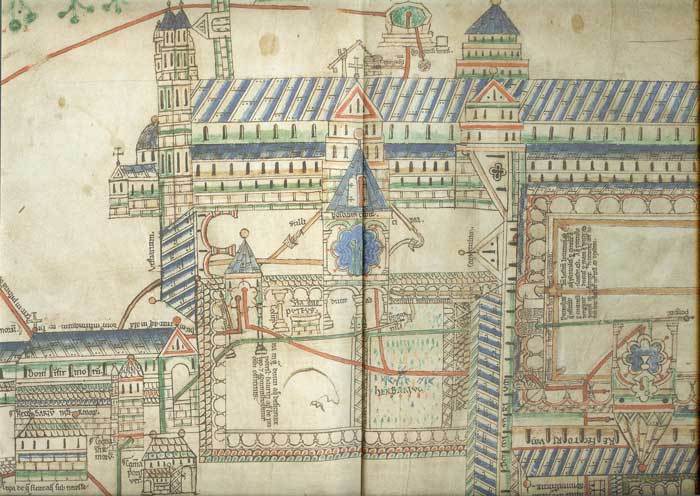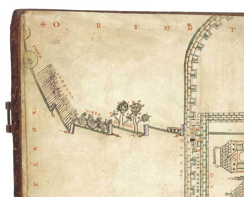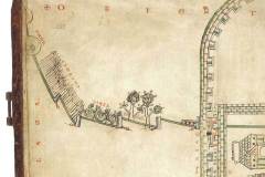 The water supply for Christ Church was stored in the surviving water tower (Image 3) A detailed plan of around 1160 showing water usage in the priory for drinking, washing, kitchens and lavatories also survives (Image 4). This remarkable document (reproduced here by kind permission of Trinity College Library Cambridge), gives pictoral descriptions of the fields crossed by the conduit pipe between Military Road and the city walls: wheat, vines and an apple orchaed (Image 5).