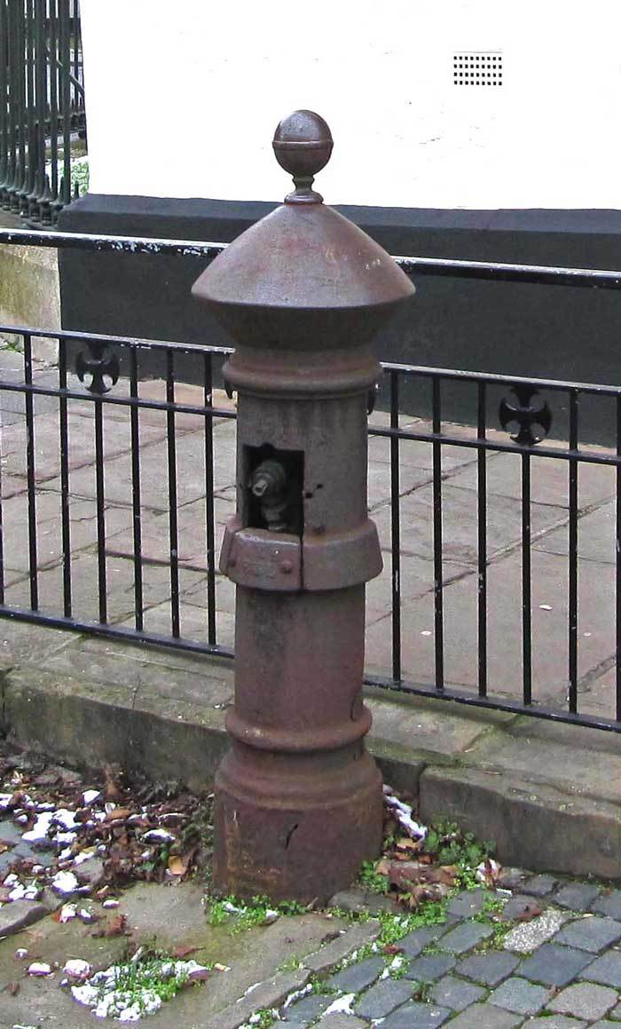 Two water related objects survive near the corner of Monastery Street and Longport. One, a plaque written in English and Latin, records the generosity of Sir John Hales in funding a water supply to the city centre in 1733 (Image 7). The plaque was originally fixed to the conduit near St Andrew’s church, but was removed to the wall of the Guildhall when the conduit was dismantled. Later, at an unknown date, it was moved again to Longport. The second is the nearby water pump (Image 8). This has been described as a converted Crimean cannon, but recent expert advice is that this is not the case.